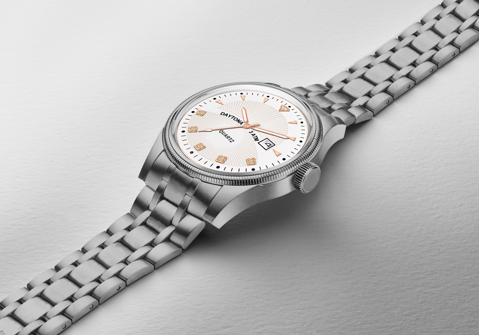 Make a statement of sophisticated luxury with the Daytona watch, a premium timepiece designed to stand out. This watch features a classic silver-tone stainless steel case and bracelet, providing the perfect backdrop for its unique white dial. The dial's sunburst pattern is beautifully complemented by sparkling gem-like hour markers and elegant rose gold-tone hands, creating an eye-catching and refined look.
