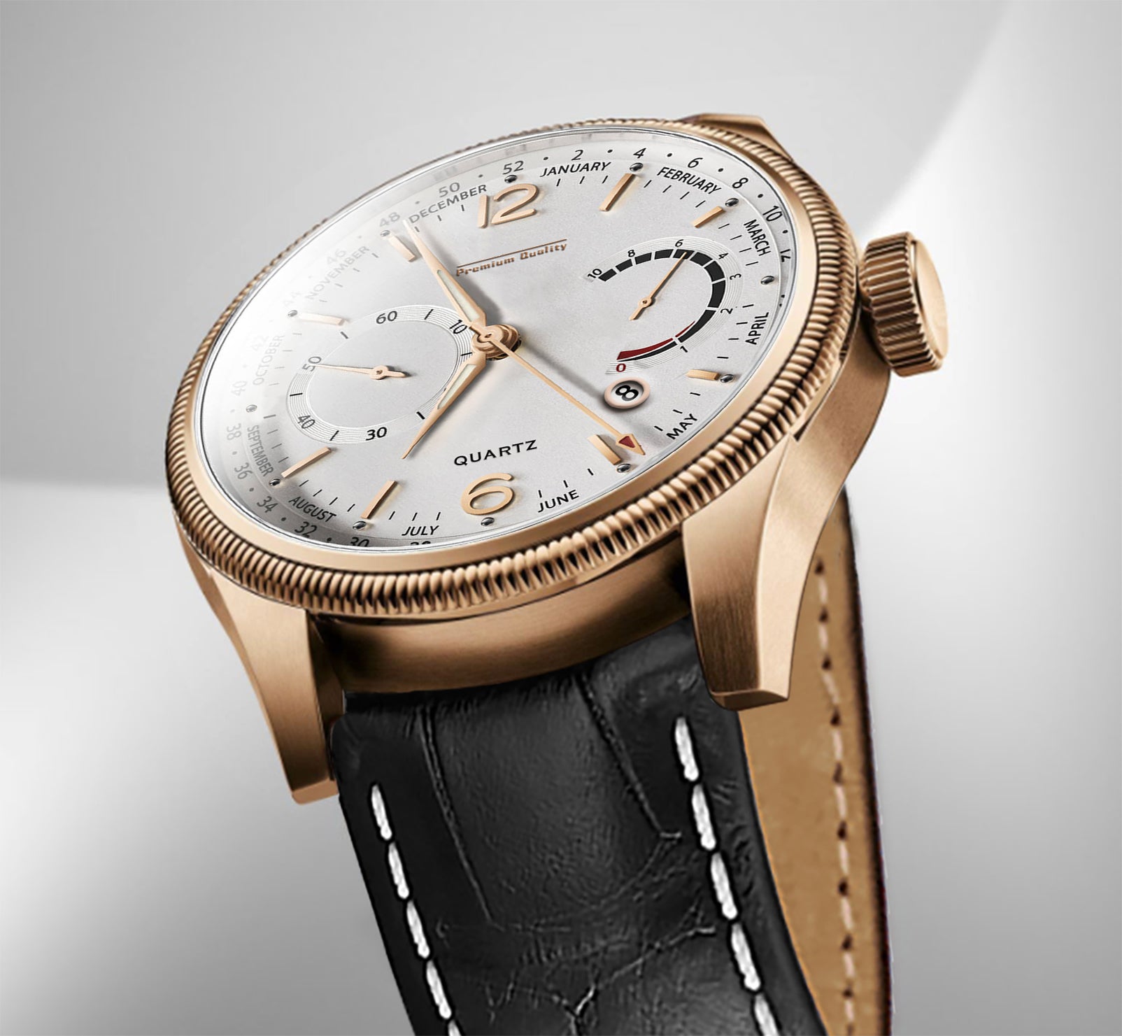 Men's Premium Multifunction Calendar Watch | Rose Gold Case, Classic White Dial, and Black Alligator-Style Strap