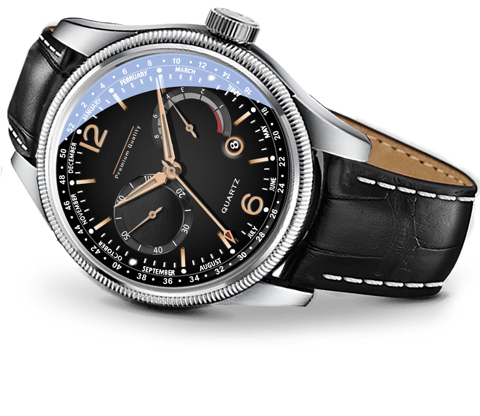 Men's Premium Multifunction Calendar Watch | Silver Case, Classic Black Dial, and Black Alligator-Style Strap