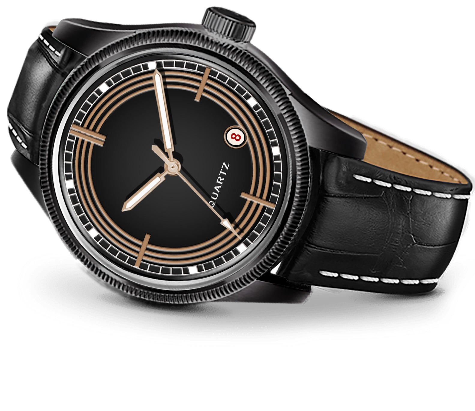 The watch is defined by its deep classic black dial, which is framed by a matte black case, offering a stealthy, sophisticated look. The baton indices and hands are finished in a subtle light bronze/gold-tone, which elegantly outlines the dial's concentric ring pattern. This ensures legibility while maintaining the dark color scheme. It includes a clear date window at the 6 o'clock position, framed in white and accented with a pop of red.